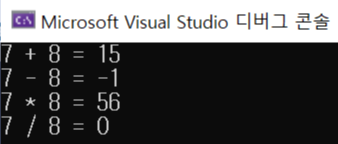 05. 7과 8을 가지고 사칙연산을 한 결과를 다음과 같이 출력하는 프로그램을 작성하라. 본문의 Lab 문제를 참조한다.