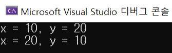 03. int형의 변수 x와 y의 값을 서로 교환하는 프로그램을 작성하여 보자. 별도의 변수가 필요하면 정의하여서 사용한다. 변수 x와 y는 10, 20의 값으로 초기화하라.